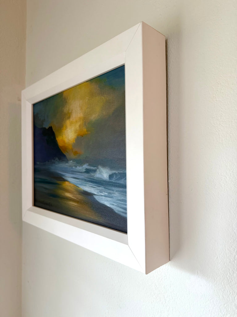 This is a silver, blue, gold, and green image of a wave breaking off shore. Its semi-neutral color palette coordinates with modern decor, but it will hang nicely in any beach cottage, wherever it is!